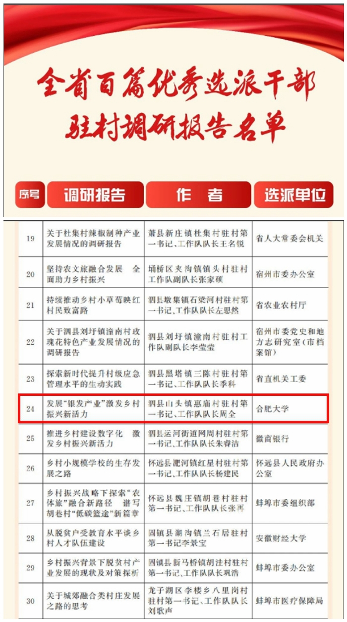 近日,我校正处级组织员、驻泗县山头镇惠庙村第一书记周全的《发展“银发产业” 激发乡村振兴新活力》调研报告成功入选全省第九批选派干部优秀驻村调研报告。