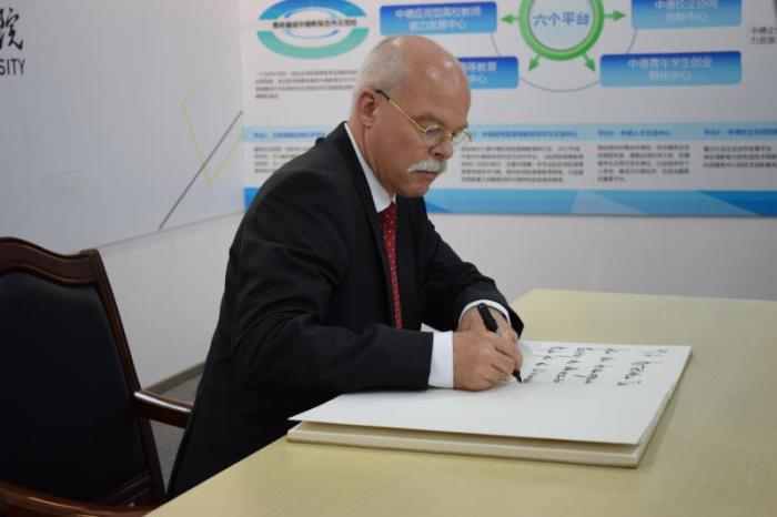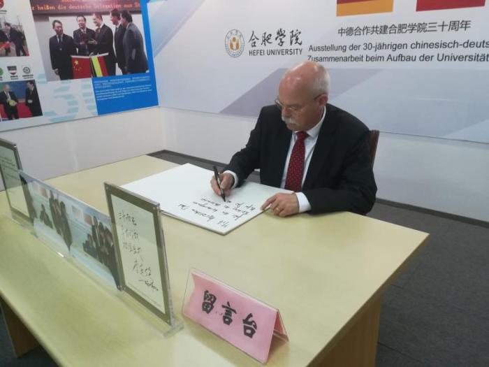 7月8日下午,德国驻华大使葛策博士一行访问合肥学院。校党委书记蔡敬民,党委副书记、校长王其东在中德友谊林热情会见来宾。德语专业的学生们手持中德两国国旗夹道欢迎,葛策博士等人与学生进行亲切交谈。