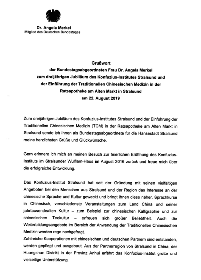 日前,德国施特拉尔松德孔子学院举行成立三周年庆典暨施特拉尔松德拉茨药房中药配方颗粒部门成立仪式,德国总理默克尔致信祝贺。施特拉尔松德市市长亚历山大·巴德罗在仪式上宣读了默克尔贺信。