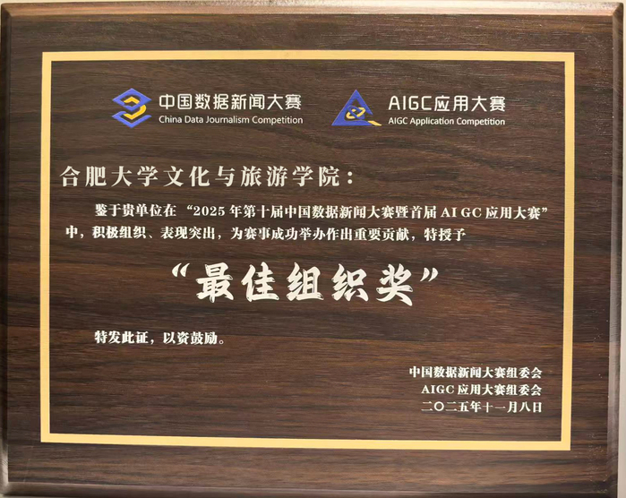 11月8日,第十届中国数据新闻大赛暨首届AIGC应用大赛暨第三届“新一代人工智能信息传播与社会治理”主题论坛在北师香港浸会大学举行。我校文化与旅游学院获一等奖2项、二等奖1项、三等奖3项、优秀奖1项,入围及获奖数量均位列安徽省内高校第一并在全国参赛高校中名列前茅。学院荣获“最佳组织奖”,张冰清、黄艳芬、唐元、王书川荣获“优秀指导教师奖”,林世华担任决赛分赛场评委。