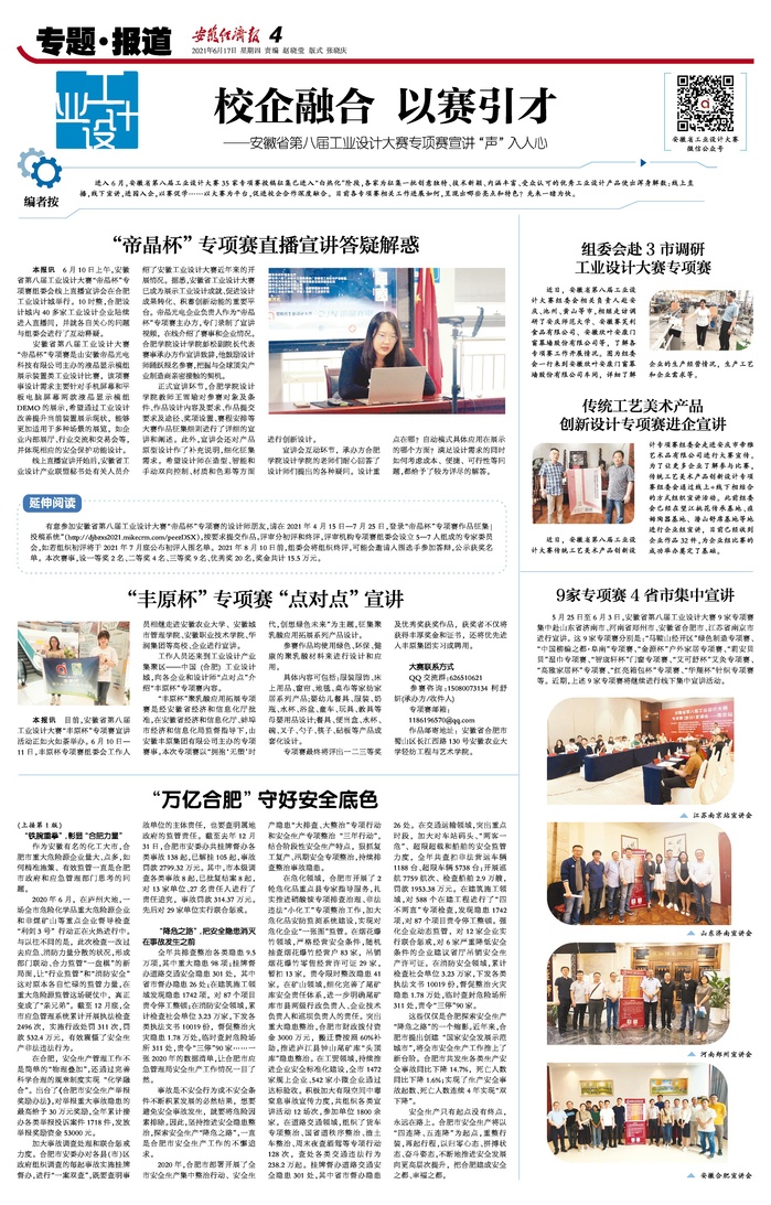 据悉,安徽省第八届工业设计大赛“帝晶杯”专项赛是经安徽省经济和信息化厅批准,由安徽帝晶光电科技有限公司主办,合肥学院设计学院、安徽欣文创意设计有限公司承办的液晶显示模组展示装置类工业设计比赛。6月10日上午,该赛事线上直播宣讲会在合肥工业设计城举行,设计学院副院长彭松代表大赛承办方作宣讲致辞,他鼓励设计师踊跃报名,把握与全球顶尖产业制造商亲密接触的契机。设计学院教师王雪瑜就参赛对象及条件、作品设计内容及要求、作品提交要求及途径、奖项设置、赛程安排等大赛作品征集细则进行了详细阐述。专项赛宣讲活动得到《安徽经济报》专刊报道,目前投稿征集已进入“白热化”阶段。