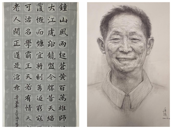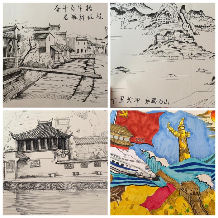 在完成金丝皇菊的包装设计和周边文创产品设计后,团队成员还举办了主题为“礼赞建党百年,书画美丽乡村”的庆祝建党100周年书画和手工作品展。同学们紧扣“农业、农村、农民”主题,突出建党100年来我国农村翻天覆地的变化。活动中,大家准备了各式各样的工具,如超轻粘土、卡纸、胶水等等,充分发挥专业特长,在三天时间内完成了绘画、书法、手工作品共60余件,准备近期在万山镇文化馆展出。