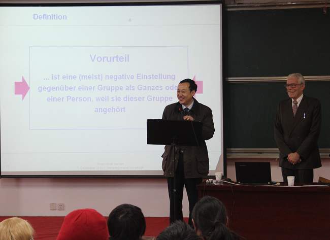 奚伟德教授通过一段风趣幽默的开场白开始了他的报告,并以不同国家人民对泰坦尼克号沉船事件的反应引出了报告主题。他详细解释了“刻板印象与偏见”的定义,形成过程以及带来的影响,并深入剖析了关于刻板印象和偏见产生的原因、类型及构成;最后向同学们讲解了正确对待“刻板印象与偏见”的方法与态度。奚伟德教授大量引用生动形象的事例,并与大家分享了他的调查研究成果。风趣幽默、深入浅出的演讲使得报告厅内气氛轻松活跃。通过此次报告,同学们不仅增进了对德国文化的了解和认识,并且进一步提高了对专业学习的兴趣。