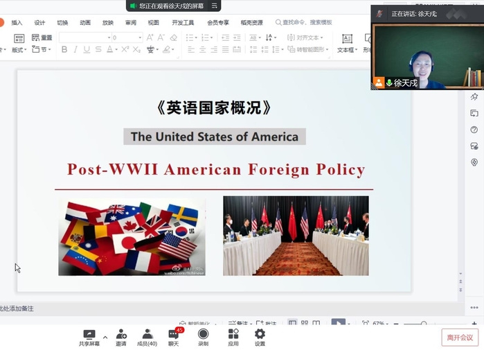 虽然已具备较为丰富的线上教学经验,但外国语学院的徐天戍老师还是坚持不断探索更好的教学方式。徐天戍本学期教授《英语国家概况2》和《英语听说2》两门课程,虽然线上课堂有局限性,但徐老师灵活并用智慧教学手段,让课堂“更智慧”。徐天戍每节课都会让学生用学习通签到,通过对比学习通签到名单和会议室在线人数,双重考勤,及时了解学生到课情况,保障到课率;通过不定时随机点名、发布主题讨论等方式,提高学生专注度;沿用翻转课堂形式,让学生完成小组任务、课前十分钟测试、课后测试、上传笔记,确保学生“真在学”。