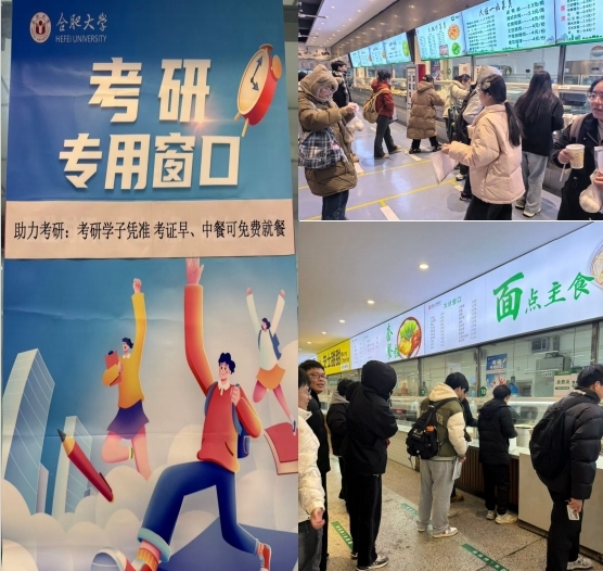 学校全力为考生提供暖心后勤保障服务,食堂开设考研专用窗口,考试期间免费供应一日三餐及暖心姜汤,提供营养均衡、种类丰富的菜品,赠送“考研助力包”,为考研学子加油鼓劲。