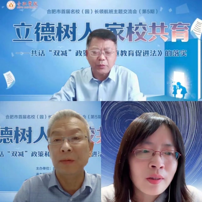 下午,合肥七中党委书记、校长邓宗国,合肥市第四十五中学教育集团党委书记、校长姚剑,合肥市六安路小学教育集团党总支副书记、校长朱清萍分别以“疫情防控背景下学生的安全问题与策略”、“双减背景下如何有效开展家校共育”、“落实‘双减’政策回归教育本真”为主题进行了交流发言。