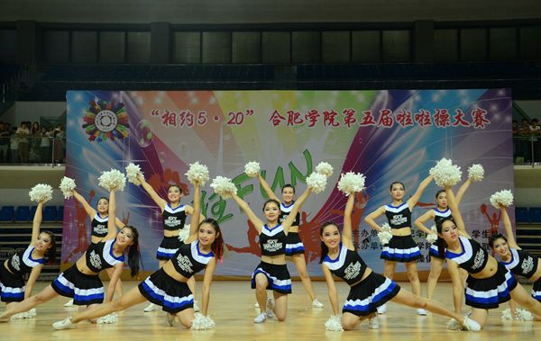在各队伍圆满完成由三人代表的个人展示后,由我校各系精英组成的火花啦啦队身着蓝白相间、印有“HFUU”标志的青春服装靓丽登场,她们的表演拉开了比赛的序幕。在规定套路中,艺术系的开场“V”字队形就让观众眼前一亮,随着他们节奏变化,队形也在不断地改变,艺术系用灵动的身姿和奔放的舞步诠释着青春的活力与热情,同时凭借张扬热烈的表演和整齐划一的表演引来全场雷鸣般的掌声和欢呼声。“扬我雄威,兴我建工!”建工系筑魂啦啦队迎面走来,他们动感的舞步,完美的编排紧紧吸引了观众们的眼球。在自选动作中,教育系队员的造型更是展现了力与美的结合,他们紧跟着音乐轻快地旋转,跳跃,不断变换着队形,整套动作流畅自然,一气呵成,明快奔放的动作显得干净利落,带给观众全新的视觉感受。随后的比赛中,各系代表队风格迥异,高潮迭起。