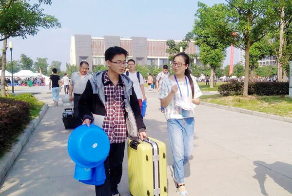 化学与材料工程系2015级新生行少冬,为了把握机会锻炼自己,只身一人,拖着行李箱背着背包坐上开往合肥的火车。历经15个小时,在9号清晨顺利到达合肥火车站。他告诉记者,一来到学校,就被美丽的风景所吸引,热心的志愿者亲自帮他排队领代购物品,并耐心介绍学校情况,一直帮他送到宿舍,完成报,让他倍感亲切