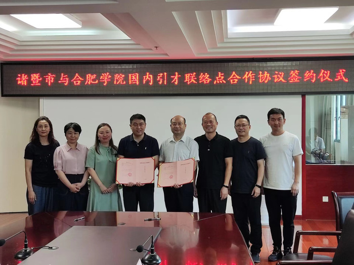 张应杰与应仲九签订了合肥学院与诸暨市国内引才联络点合作协议。