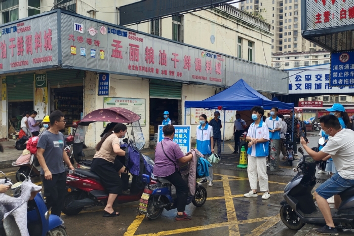 图为温司君同学在阜阳市冷寨社区菜市场路口进行测温扫码