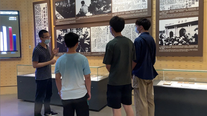 图为带队老师威力旺在为调研成员讲述渡江战役故事