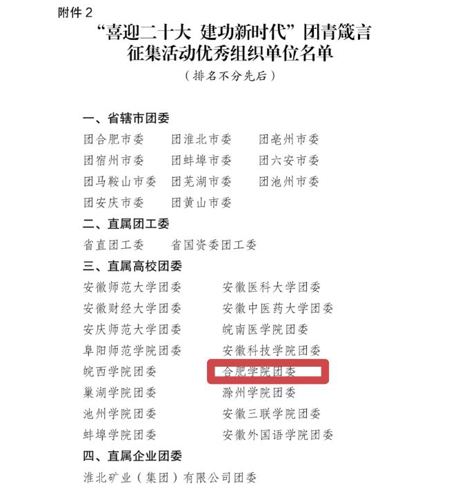 为迎接党的二十大召开,扎实推进从严治团,引领青年奋进新征程,共青团安徽省委举办了“喜迎二十大 建功新时代”团青箴言征集活动。我校学生多件作品在评选中获奖,我校团委荣获“优秀组织单位”称号。