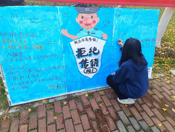 “深”字打底,巩固成效。校青志联开展防范传销宣传教育交流会,向广大学生揭露了传销的违法本质和巨大危害,志愿者们纷纷举手宣誓,提笔在横幅上签字,以表达抵制传销的决心。先进制造工程学院以“反传销”为主题组织开展辩论赛,生物食品与环境学院举办主题为“防诈骗 防传销”的安全教育讲座,设计学院组织学生党员观看防范传销教育宣传片,外国语学院充实反传销宣传联防志愿者队伍提供知识咨询服务,引导学生在各类活动中加深对非法传销的欺诈性、隐蔽性和危害性的了解,增强防范传销“免疫力”。