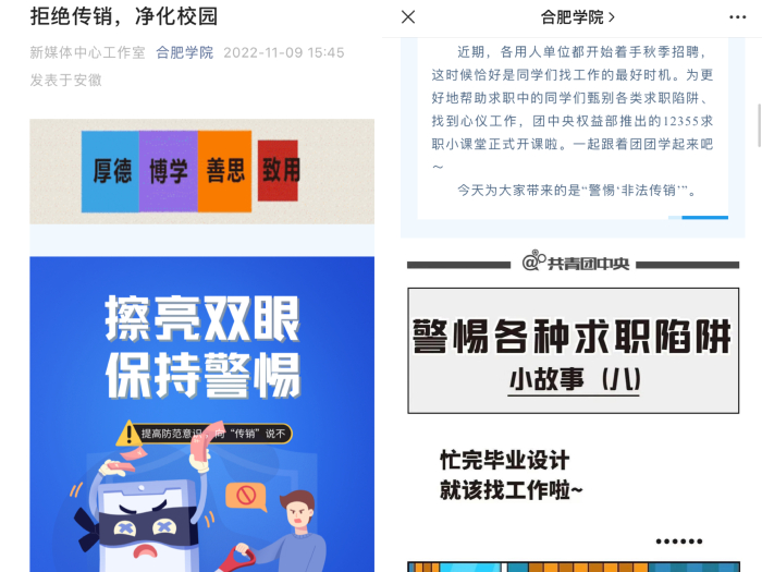 “广”字先行,全面宣传。合肥学院官方微信公众号以“秋招”为切入点,通过漫画故事等大学生喜闻乐见的形式,帮助学生识别传销陷阱、顺利求职。各二级学院也纷纷通过宣传栏、宣传展板、微信、微博、QQ等渠道,向广大学子宣传防范传销知识,切实扩大校园防范传销宣传教育活动的覆盖面,营造抵制传销的浓厚氛围。人工智能与大数据学院、城市建设与交通学院、旅游与会展学院、语言文化与传媒学院充分发挥教育主体作用,把防范与打击传销作为思想政治教育、新生入学教育、毕业生就业指导教育的重要内容,通过召开党支部会议、主题班会、座谈会,以及走访宿舍、散发宣传单页等形式,送防范传销知识“上门”。