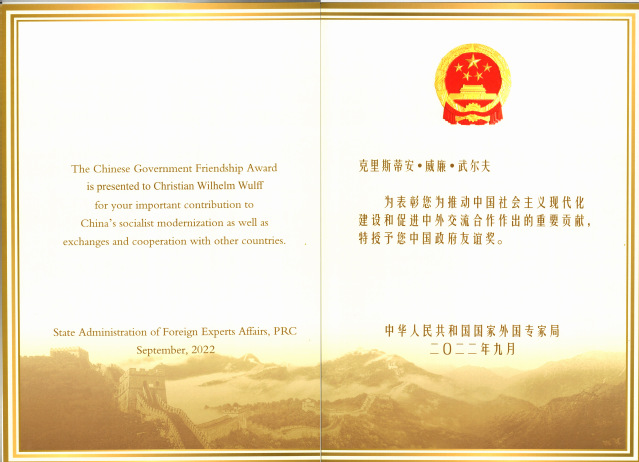 Ehrenprofessor der Universität Hefei und ehemaliger Bundespräsident Christian Wilhelm Wulff gewinnt den Chinese Government Friendship Award 2022