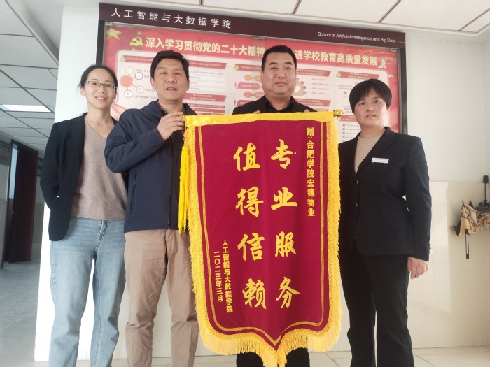 近日,我校后勤集团宏德物业收到了来自人工智能与大数据学院的“专业服务,值得信赖”锦旗,这面锦旗承载着学院师生对后勤集团工作人员长期温情付出、贴心服务的高度认可。