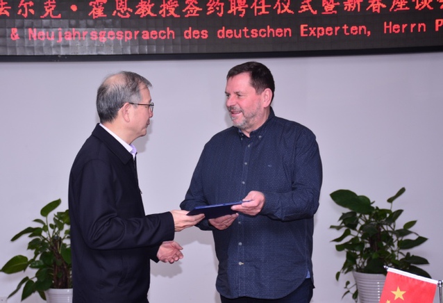 Am Morgen des 10. Februar fand an der Universität Hefei im Konferenzraum im 9. Stock des Verwaltungsgebäudes eine Ernennungsfeier für ausländische Professoren und ein Neujahrssymposium statt, bei dem Falk Höhn von der Hochschule Hannover in Deutschland als ausländischer Professor eingestellt wurde. An der Zeremonie nahmen der Parteisekretär Wang Qi Dong und die Präsidentin der Universität Hefei Wu Chunmei teil. Die Verantwortlichen des Organisationbüros, des Büros für akademische Angelegenheiten, des Personalbüros, des Büros für internationalen Austausch und Zusammenarbeit, des Büros für Masterstudierenden, der Fakultät für Design sowie der Fremdsprachenfakultät nahmen auch an der Zeremonie teil. Herr Wang Qidong stellte Professor Höhn ein Ernennungsschreiben aus, Frau Ji Ping, Direktorin der Personalabteilung unterzeichnete im Namen der Universität eine Ernennungsvereinbarung mit Professor Höhn.