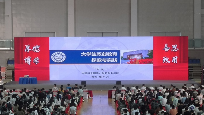中国科学技术大学团委副书记、创新创业学院副院长刘淇为新生作《大学生双创教育探索与实践》专题报告,他从大学生创新创业教育的背景、重要性、相关政策以及发展现状入手,结合中国科学技术大学针对大学生创新创业教育的探索过程与实践案例,鼓励新生以创新驱动自我成长。
