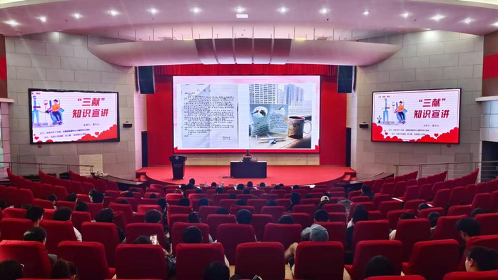 4月18日下午,合肥市红十字会和安徽省血液中心、合肥市中心血站主办的首场“三献”知识专题讲座在我校举办。马克思主义学院退休教师姜从山作为主讲人,向学生讲述和分享“三献”相关知识。合肥市红十字会事业发展部副部长王双全,合肥市中心血站无偿献血招募区域主管郑东、张磊、褚媛,校关工委秘书长刘玉培,团委副书记李妍妍和300余名学生到场聆听。