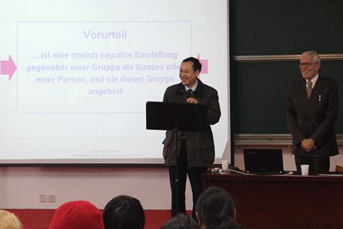 奚韦德教授从西方视角解析文化的内涵,并对比中国视角下的文化内涵,通过对文化进行深入分析,以中国、德国以及美国等为例,讲述了不同文化的具体表现形式。他还谈到中国逐渐成为德国的重要投资国,这已成为一种发展趋势,并对比了不同国家在不同的时间、空间和环境下文化差异的具体体现。他还通过大量的图片和数据,生动有趣地对中德合资企业的跨文化管理进行了深入浅出的分析。奚韦德教授精彩的报告内容,风趣幽默、深入浅出的演讲风格使得报告现场气氛轻松活跃,他还与师生进行了互动和沟通。