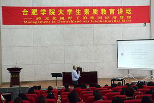 奚伟德教授是一位学者型的企业家。在繁忙的工作之余,他从来没有忘记过他在合肥学院的教育事业。2015年6月,已成为德国奥斯纳布吕克大学经济学系博士生导师的他又一次来到合肥学院,做客大学生素质教育讲坛,开展了题为《从跨文化视野看德国经济管理》专题报告。