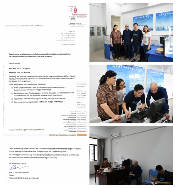 我校电子信息与电气工程系顾涓涓教授和胡国华副教授受德国施特拉松应用科学大学委托,共同担任该校在读硕士研究生Feldhaus Pascal的毕业论文指导教师,指导时间为2016年4-10月。该生已于4月19日来到合肥学院,开始为期7个月学习和研究,主要完成室内导航和定位系统的设计与开发项目,并完成其硕士毕业设计(论文)。