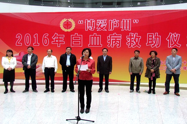 爱心涌动,情暖庐州。由合肥市红十字会发起的“博爱庐州”项目2016年白血病救助仪式10月21日在市政务中心阳光大厅举行。安徽省红十字会党组书记、常务副会长张青参加仪式,合肥市政府副市长、市红十字会会长吴春梅出席仪式并讲话,省红十字会,市委宣传部、市民政局、市教育局相关负责人,9个县(市)区红十字会负责人,11位待救助的白血病患儿家长,合肥学院大学生红十字会志愿者代表等百余人参加了活动。