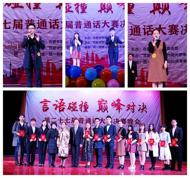 11月25日,由合肥学院党委宣传部主办,合肥学院广播台阳光旋律承办的第二十七届普通话大赛决赛于致用礼堂隆重举行。安徽省朗诵艺术协会副秘书长、国家级普通话水平测试员、合肥学院中国语言文学系副教授周鹂,安徽省语言协会理事、国家级普通话水平测试员、合肥学院中文系教师陈红燕和安徽省朗诵艺术学会理事陈刚等应邀担任评委。来自合肥工业大学、安徽大学、安徽中医药大学等高校广播台代表作为嘉宾出席本次比赛。10号宋子涵荣获一等奖,3号嵇名浩、9号刘恩昊获得二等奖,1号张希迪、8号周宇飞和11号杨议朝获得三等奖,其他参赛选手获优秀选手奖。