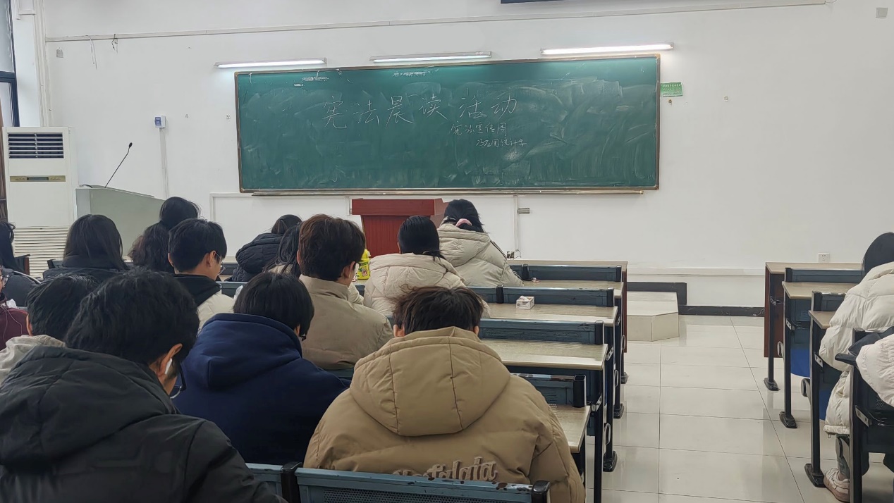 清晨,阳光洒在校园的每一个角落,参与活动的同学们都已准备就绪。教室里,同学们正襟危坐,手持宪法晨读内容,聚精会神地阅读宪法相关知识,细细品味宪法的发展历程与理念原则,沉浸在宪法的魅力当中。大家的朗读声洪亮而坚定,回荡在教室中,弥散在校园里,徘徊在每一位尊崇宪法的人的心间。