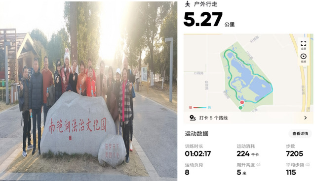 随着负责人口令下达,参与者们沿着湖边风景秀丽的步道,由南至北开始环湖健身走,全程约5公里。途中,大家欢声笑语,尽情享受自然美景。行至体育公园一隅、阳光大草坪、公园主入口、紫薇林荫道等指定拍照打卡点时,教职工们纷纷拍照留念,并即时将照片分享至学院群,现场充满活力。