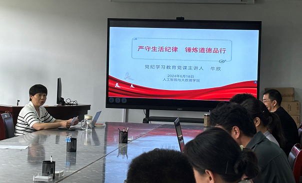 2024年6月18日下午2:00,在36栋305会议室人工智能与大数据学院党委书记牛欣给两个教工支部作“严守生活纪律,锤炼道德品行”党纪学习教育专题党课,人工智能与大数据学院教工第一党支部、教工第四党支部两个支部的全体党员教师参加。