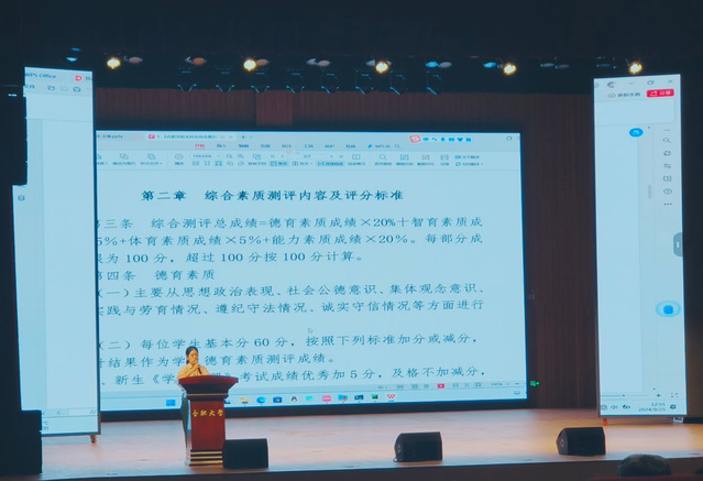张银双老师特别强调了参加各类竞赛的重要性,指出这不仅是为了综测加分,更是学生提升个人能力、积累宝贵经验的良好平台。而减分细则中主要有旷课,考试作弊等一些大学生不应该做的不文明不道德行为,并告诫全体新生应严格遵守纪律,维护良好的校园风气。