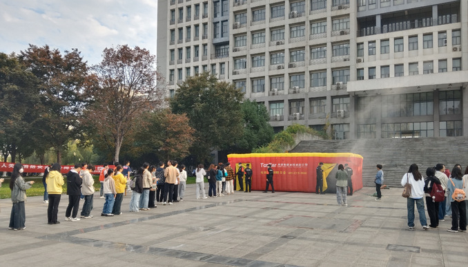为深入贯彻落实习近平总书记关于安全生产和消防安全的重要指示批示精神,响应2024年全国消防宣传月“全民消防、生命至上”的活动主题,保卫处联合校团委于11月13日在二期主教学楼前举办了消防逃生屋体验活动;先进制造工程学院、城市建设与交通学院、生物食品与环境学院、能源材料与化工学院 、设计学院、语言文化与传媒学院、外国语学院、旅游与会展学院约600人参加了此项活动。