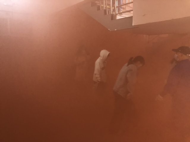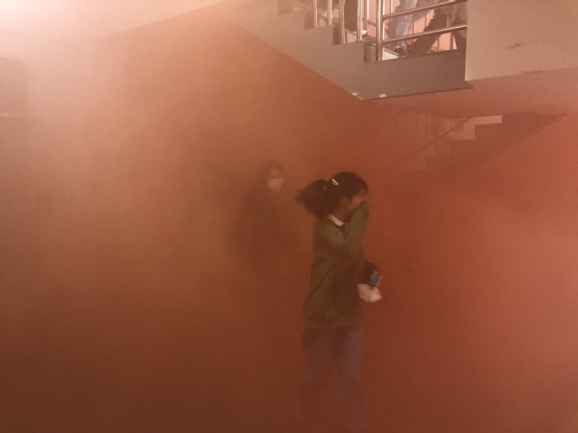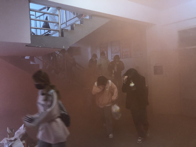 本次演练由保卫处制定方案,并指导楼宇服务的物业公司组织实施。物业公司做到了:演练前进行任务分工(定人、定位、定责任),并进行了演练前的动员,明确安全注意事项。紧接着,所有疏散引导人员到位,提醒学生做好疏散演练准备。随着总指挥演练开始命令的下达,演练正式开始:
