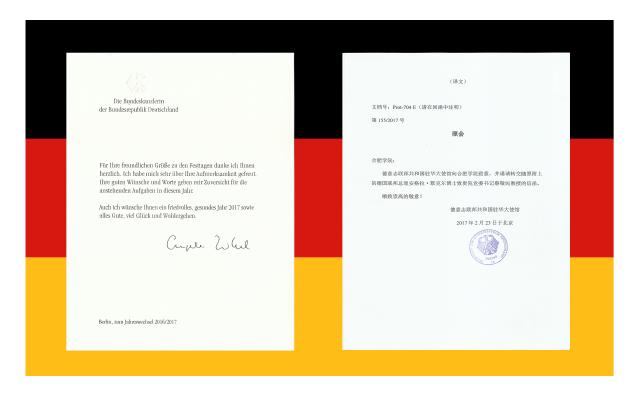 这是学校第3次收到默克尔总理亲笔信。此外,学校还收到时任德国总统伍尔夫先生2次亲笔信。