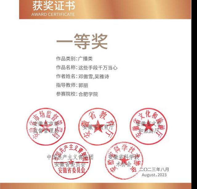 投入、大收益?大学生质量文化与品牌创意设计大赛值得了解一下! 参赛选题确定参加比赛,首先要仔细研读参赛命题,基于自身的专业能力、兴趣方向、人脉资源确定赛道,而后选择命题。在第三届安徽省大学生质量文化与品牌创意设计大赛发布通知和命题时,我的参赛经验告诉我,一般情况下,各类广告比赛公益命题相比较而言容易拿奖一点,所以我选择了公益类赛道——宣城市宣州区人民政府。而后,我清楚自己的核心优势在于文字和创意,所以我选择了公益命题下的文案类和广播类——防诈骗宣传。 选题确定后,其实可以大概思考一下创意方向和作品形式,这样便知道自己需要什么样的合作伙伴,这时候再去组建团队就会更有针对性,也会更高效。此外,先拿着一个创意想法(即使很粗糙),去组建队伍的成功率也会更大。 参赛队伍组建参赛队伍组建很自由,本校学生都可组队参与,但各类别也是有不同的人数要求的,需要提前了解清楚。对于文案类其实一个人就可以完成,所以效率高很多,比赛也没有参赛作品限制,可以考虑“广撒网”——针对不同命题都写一条,都参加一下,说不定就拿奖了。而对于广播类或者其他类别,其实一个人也可以,但是前提条件是,个人必须具备良好的声音条件和创意能力,以及一定的音频剪辑能力。 由于我一直有个比较信任的同学,所以首先就邀请了她加入团队。此外,我一开始就对选题有了一点想法和设计,所以我知道自己的个人嗓音条件并不适合我的选题,于是我开始寻找自己的合作伙伴。我并没有将合作伙伴限制在自己的班级同学,而是思考我的整个朋友圈里面有没有唱歌比较甜美、嗓音比较好的朋友。而后想到了小学教育专业的同学们嗓音条件都比较好(因为一起上过思政课),所以我就通过朋友的朋友联系到了一位21级同学,说明想法后,便开始了合作。 广告创意设计大学生质量文化与品牌创意设计大赛中,无论是何种参赛类别,重要的都是广告创意设计。好的广告创意首先应当是清楚的——能让人一下就看懂、读懂、听懂,保证广告传播效率;其次,优秀的广告创意则是可以一下击中人心、引发共鸣的,这点要求比较高;为此,需要团队或个人充分了解广告对象,大胆联想一切已有的各类作品,进行头脑风暴。 在本次比赛中,我们团队首先明确防诈骗采取广播,那么必须让人听到便能够记住一定,因为广播是转瞬即逝的,所以旋律很重要。为此,我们检索了很多自己听过的歌曲,要求旋律简单、能够轻松传唱,最后确定了《咖喱咖喱》这首歌(因为本人经常在公园里听到大爷大妈们放这首歌做运动)。此外,考虑到我们的受众人群,大多为老人或者青年群难题,而这首歌比较活泼,适合各年龄段,所以最终敲定歌曲。而后便开始填词工作。搜集常见诈骗手段,整合填词即可。 广告音频制作广告创意很重要,但最重要的其实是落地。因为想得再好,做不出来都是没用的。所以在音频确定后,团队苗均繁同学在各类空间用各类设备多次尝试演唱,最后选择了最好的一版。 而要达到可以直接使用的音频状态,则一定需要音频剪辑完善。这里推荐Audacity,Audacity是一款免费且开源的音频编辑器,适用于Windows、Mac和Linux系统。它拥有强大的功能,包括多轨编辑、降噪、混音、添加效果等。Audacity界面简洁易用,非常适合初学者和业余爱好者。 我也是为了比赛现学的,各位不会一项技能也没关系,可以以赛促学,倒逼自己学会一些技能,提升自我。 参赛作品提交最后就是作品提交啦,重要的是学会“包装”自己的作品,说明其创意点、传播效果、制作经历等等,让评委看到作品提交表就对你的作品感兴趣。 比赛荣誉