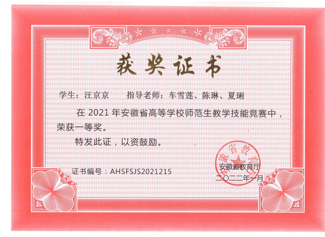 2021年,汪京京被老师选中去参加安徽省高等学校师范生教学技能竞赛,技能竞赛的内容包括教学设计、说课、保教视频分析、弹唱、讲故事、歌唱表演、绘画,备赛过程中,她反复磨炼、不断请教,总结后自我反思,最后一遍接着一遍巩固练习,那段时间总能捕捉到她在校园里忙碌的身影,她说这是机不可失的锻炼机会,为她毕业后考入无锡市幼儿教师编制打下坚实的基础。