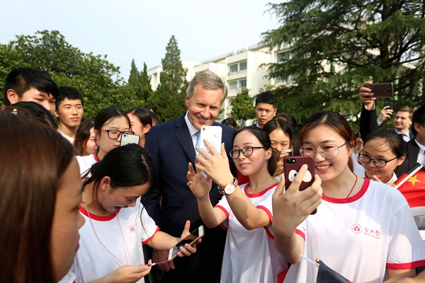 6月19日下午,充满热情和期盼的学生们站立在合肥学院图书馆报告厅大门两侧,手持中德两国国旗热烈欢迎武尔夫先生的再次到来。一路上,武尔夫主席多次驻足与师生代表亲切交流。