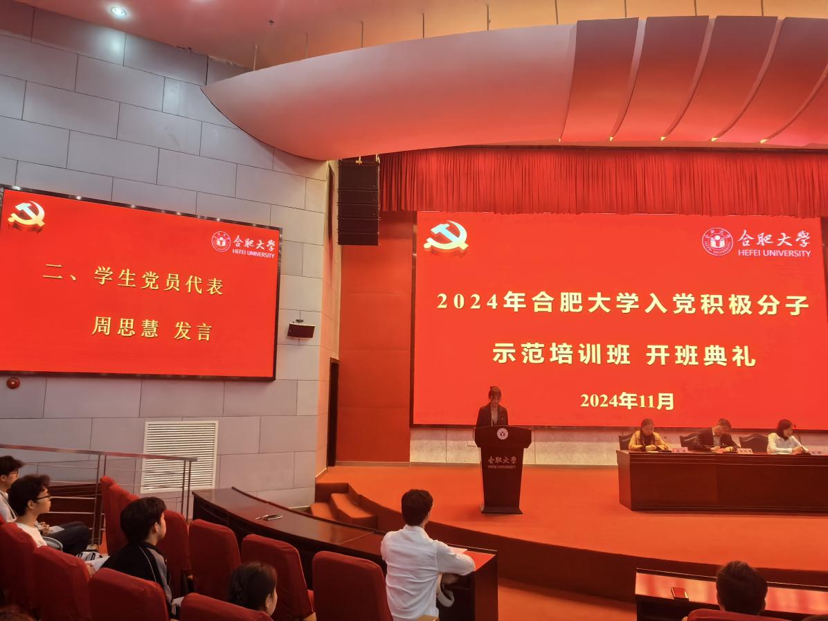 2021级机械电子工程1班周思慧同学作为党员代表发言。她表示,通过参加入党积极分子培训,自己对党的性质、宗旨、奋斗目标有了更加深刻的理解,党性锻炼得到了进一步增强,在各类比赛中取得一系列荣誉,并光荣地加入了中国共产党。她鼓励新一批入党积极分子不忘初心、牢记使命,以实际行动积极向党组织靠拢。