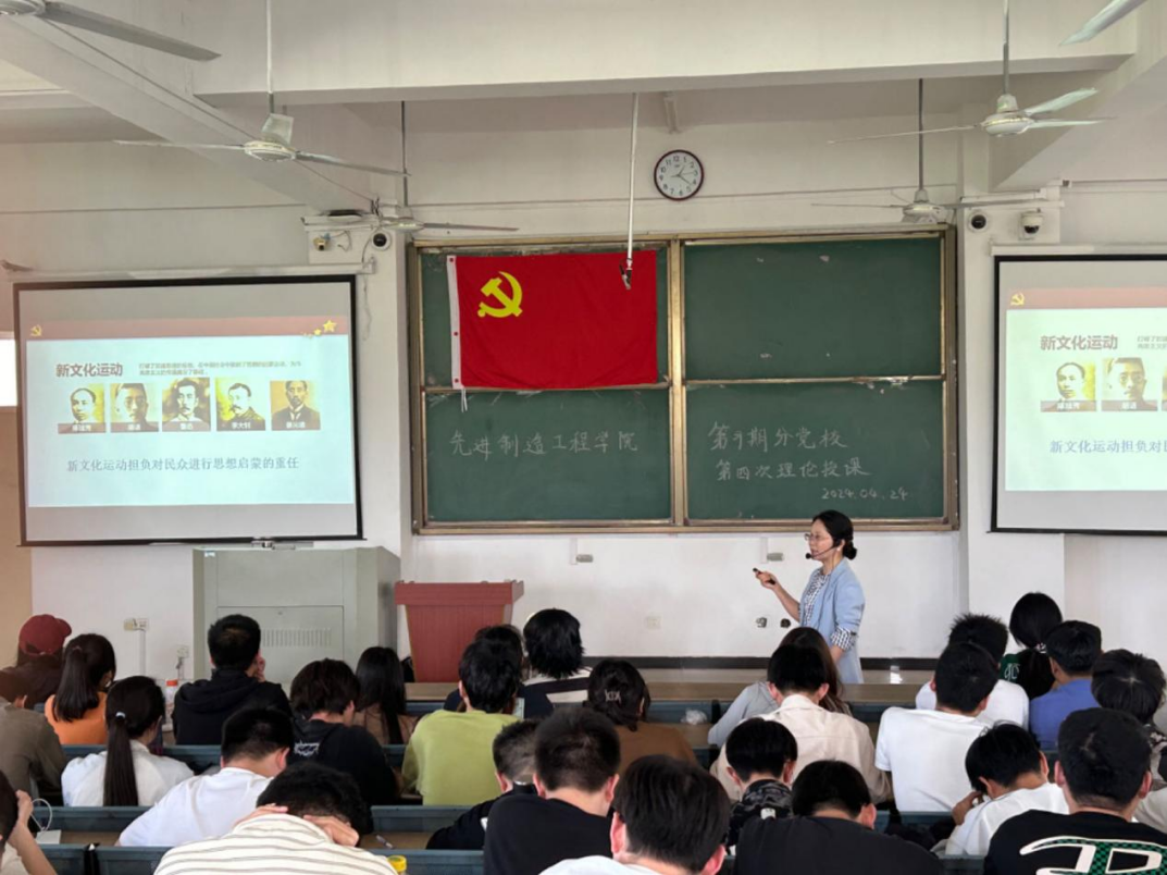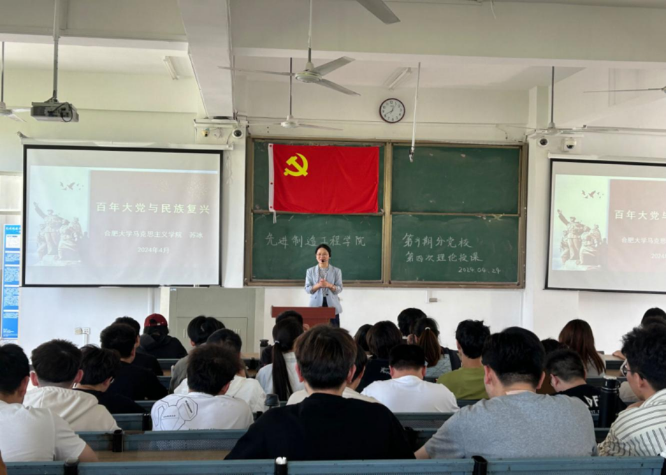 2023年4月24日中午12:40分,先进制造工程学院分党校第九期入党积极分子培训班第四次理论授课于38栋3阶梯教室举行,本次党课由马克思主义学院直属党支部书记、副院长苏冰教授进行授课,先进制造工程学院分党校第九期培训班共103名学员参加了本次课程,党课主题是“百年大党与民族复兴”。