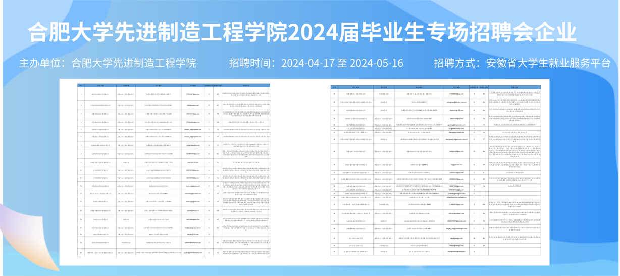 为推动2024届生实现高质量就业,把握企业春招的机遇,2024417 日至 516日,先进制造工程学院依托安徽省大学生就业服务平台举办2024届毕业生专场招聘会,通过云招聘的形式,为用人单位和毕业生搭建线上双选平台,实现毕业生充分就业、精准就业。