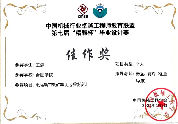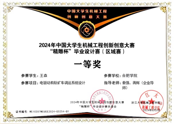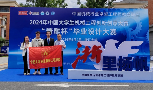 202462,由中国机械工程学会和中国机械行业卓越工程师教育联盟共同主办的中国机械行业卓越工程师教育联盟“精雕杯”毕业设计大赛决赛在浙江大学举行。先进制造工程学院党委书记杜娟、副院长秦强带队,2020级机制专业王森同学携其毕业设计作品参赛,获比赛佳作奖。