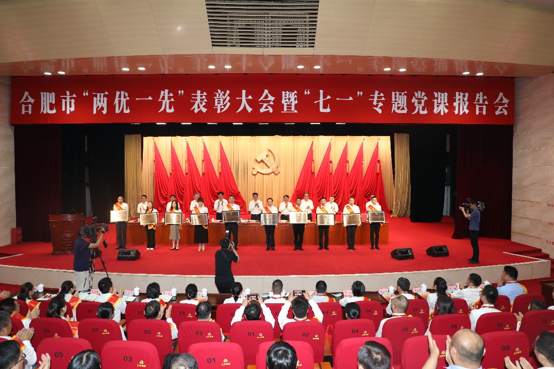 会议宣读了合肥市委表彰决定,现场为全市“两优一先”表彰对象代表颁奖,先进制造工程学院党委书记杜娟作为合肥市先进党组织代表上台领奖。
