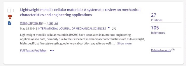 根据科睿唯安(Clarivate Analytics)公布的20247ESI最新数据, 我校先进制造工程学院青年教师王二冬2024以日韩欧美福利视频_黑人巨大人精品欧美三区_欧美成人另类人妖_欧美在线精品一区二区三区_欧美一区二区三区性视频_日韩精品欧美视频_性欧美极品xxxx欧美一区二区为第一单位在《International Journal of Mechanical Sciences期刊上发表的长篇综述论文Lightweight metallic cellular materials: A systematic review on mechanical characteristics and engineering applications(Volume 270, May 2024)成功遴选为ESI高被引论文。目前,Web of Science数据库显示该文献已经被引用27次。《International Journal of Mechanical Sciences》杂志是机械工程/力学领域国际权威期刊 (中科院一区Top,影响因子:7.1),这是我校机械领域首篇以第一单位入选为ESI全球前1%高被引论文,是我校学科建设取得重要的科学研究成果。