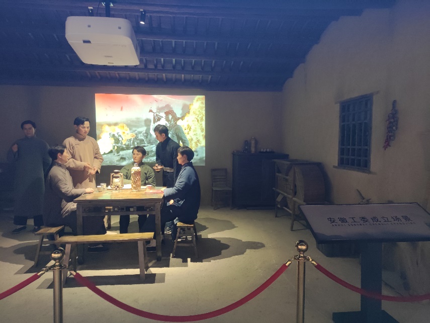 继续往前走去,最引人注目的莫过于那组生动再现中共安徽工委成立场景的蜡像。这些蜡像栩栩如生,细节之处尽显匠心,不仅人物的神态、动作被刻画得惟妙惟肖,就连当时的场景氛围也被完美地营造出来。蜡像中的每一位人物都仿佛有了生命,他们或激昂陈词,或沉思默想,或紧握双拳,共同展现出了中共安徽工委成立时的那份坚定与决心。站在这些蜡像面前,仿佛能够听到历史的回响,感受到那股从过去穿越而来的革命激情。随后,团队成员来到了在安徽工委带领下开展抗战斗争事迹的展馆部分。这个展馆以生动而详实的方式,再现了那段烽火连天的岁月,展馆中设有3D投影展示,身临其境地展示了到那个时代的氛围和斗争的残酷。通过现代化的展示手段,历史不再仅仅是书本上的文字,而是变得鲜活起来,触动着每一个人的心灵。随后,团队成员怀着沉痛的心情,共同阅读了刘云峰烈士的生平介绍,刘云峰烈士的英勇无畏、坚定信念以及为革命事业献身的崇高精神,也将成为激励我们不断前行的强大动力。