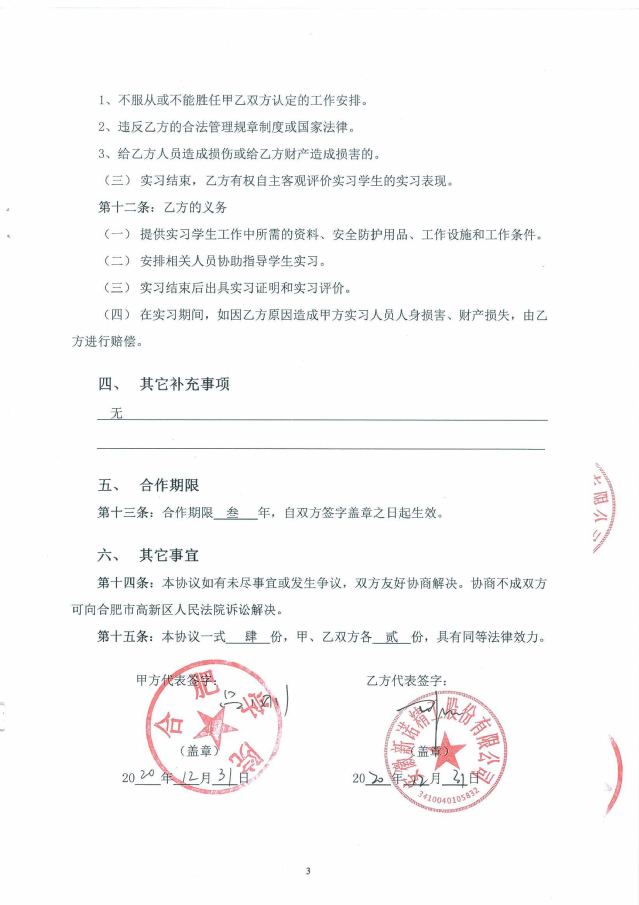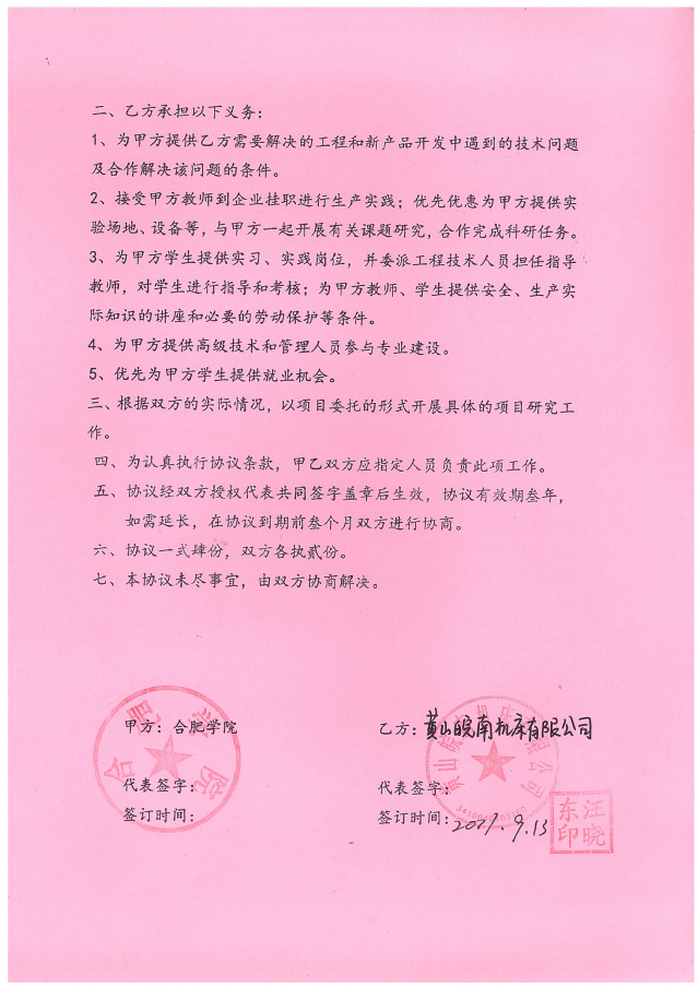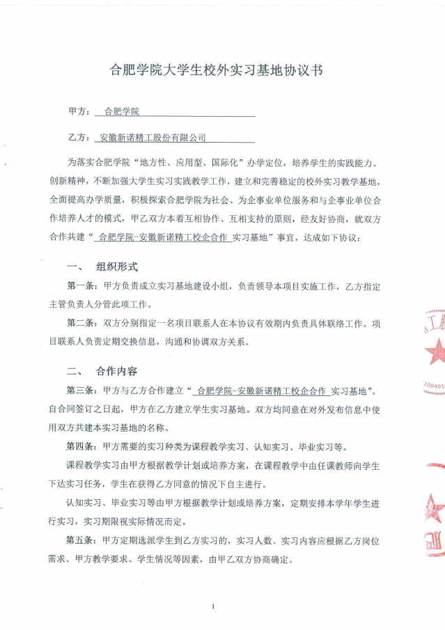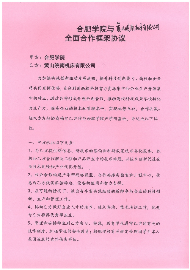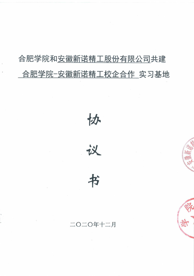 合肥学院与安徽新诺精工股份有限公司(原黄山皖南机床有限公司)经过友好协商,于2017年9月签订了全面合作框架协议,正式开启了合肥学院-安徽新诺精工校企合作实践教育基地的建设。2020年2月,双方又再次签署了共建实习基地的协议书。合作协议的签订,不但明确了校企双方在合作基地建设中的权利和义务,为双方顺利开展各项实践教学工作,高质量地培养学生综合实践能力和创新能力奠定了基础;同时也为合作基地的健康发展,以及校企双方开展全面合作起到了积极的促进作用。