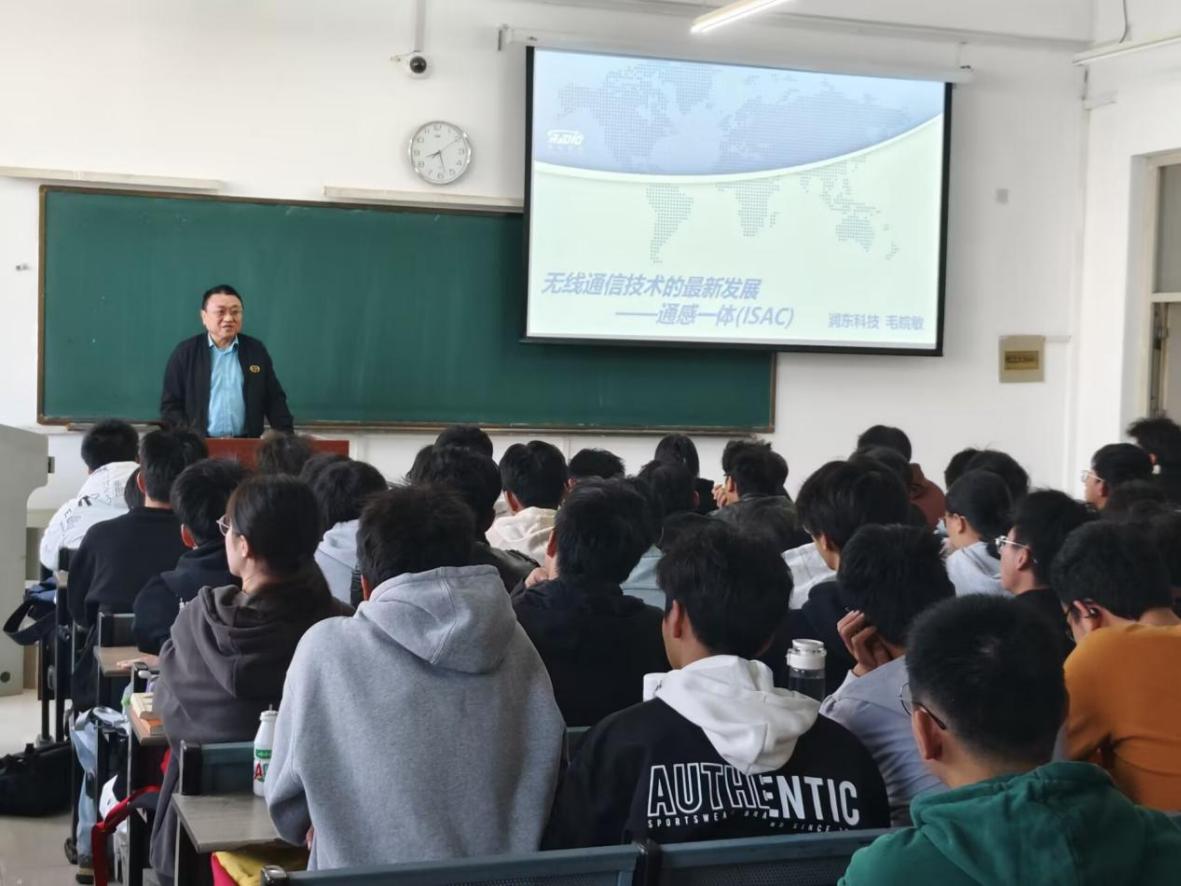 11月5日,专业邀请了合肥润东通信科技股份有限公司毛皖敏董事长做了《无线通信技术的最新发展--通感一体(ISAC)》的专题报告。报告伊始,毛皖敏董事长介绍了其企业相关产品,然后,然后报告围绕通信技术的发展、5G通信的应用场景、通感一体无线通信和6G关键技术逐一展开,最后,毛总跟同学们阐述了职业发展的路径,并对同学们四年的大学活提出了期望。
