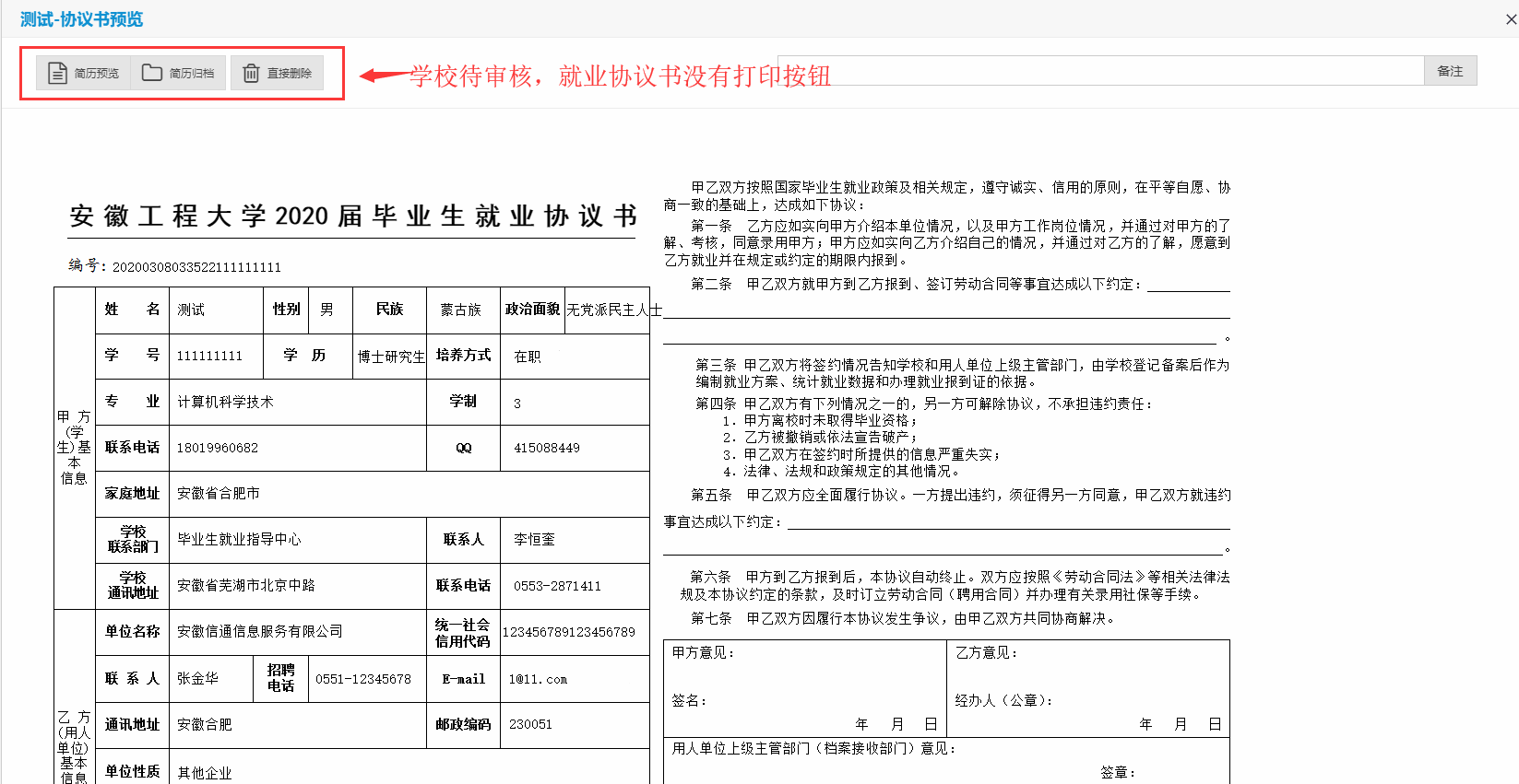 审核后的数据自动转入“协议书打印管理”模块,再点击学生姓名,进入打印页面,即可在线打印“协议书”。