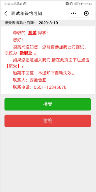 第五步、毕业生收到签约通知,并选择是否接受面试邀请。