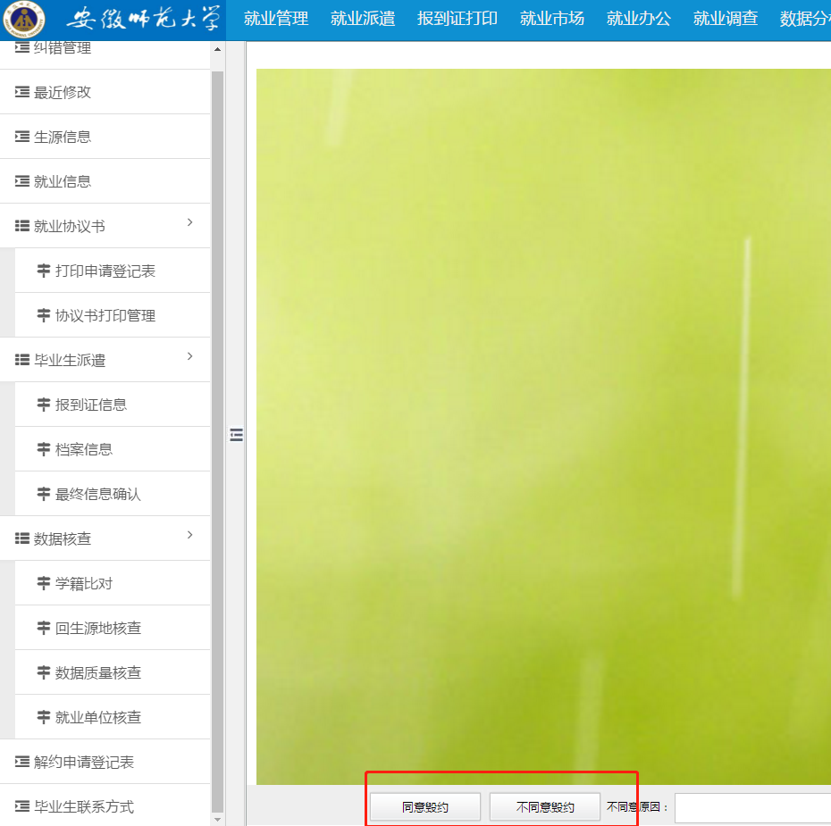 第二步、辅导员进入系统,点击上方“就业派遣”,再点击左下角“解约申请登记表”,点击申请学生姓名,进入审核页,点击“同意毁约”或“不同意毁约”即可。